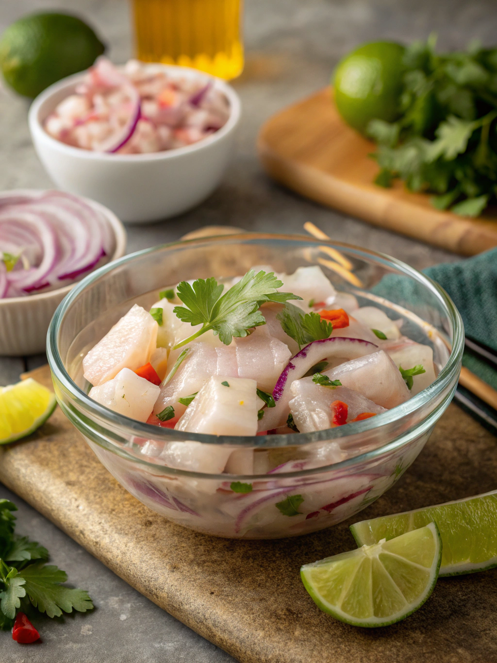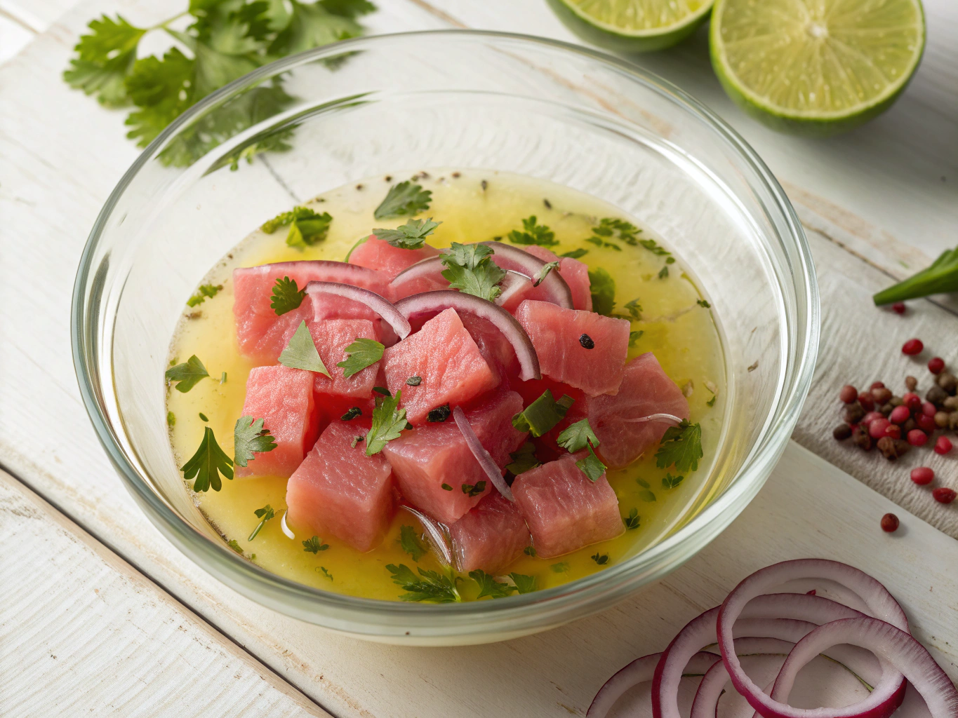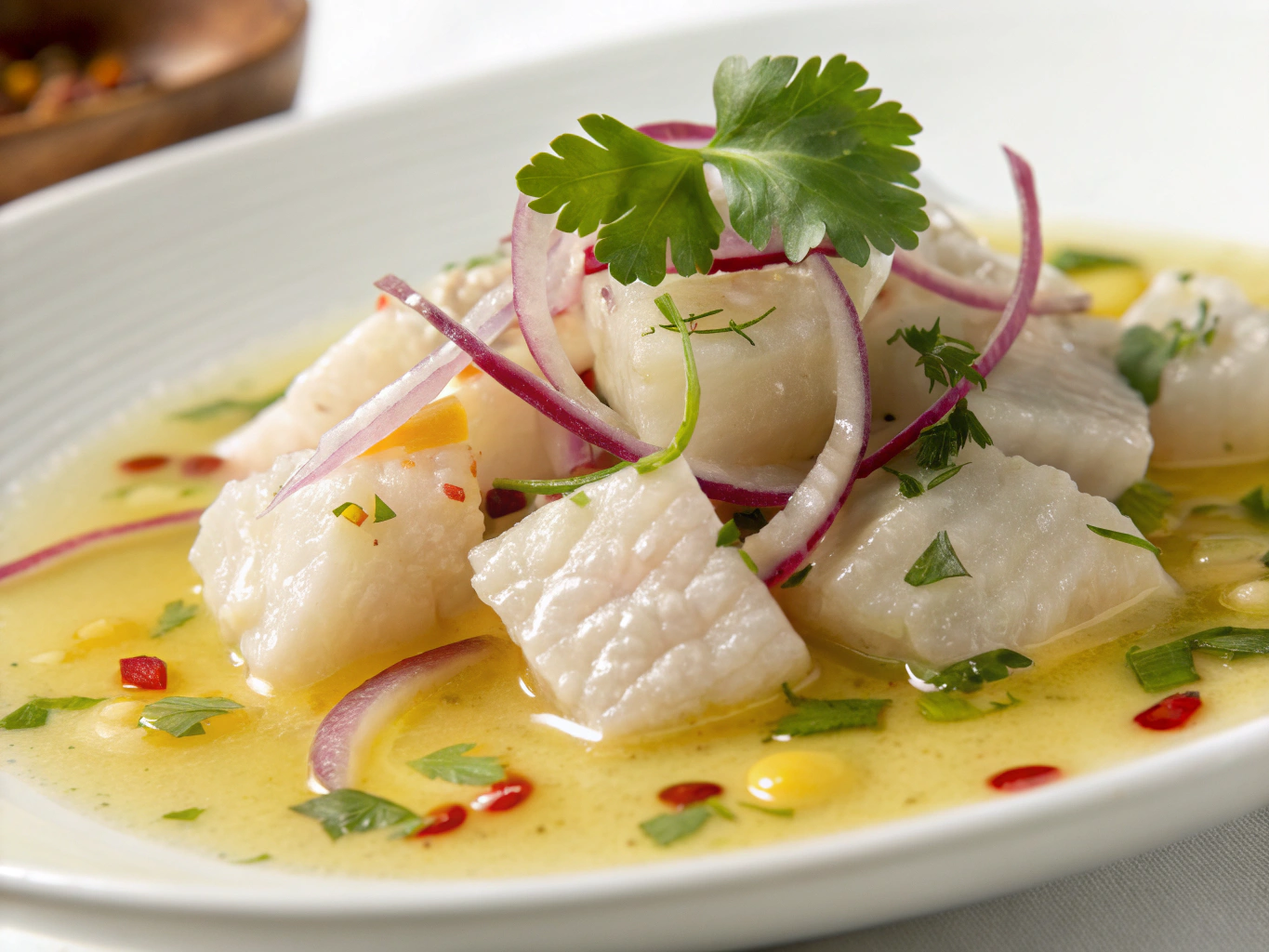 Ceviche caribeño: frescura del pescado local con lima, cilantro y frutas tropicales